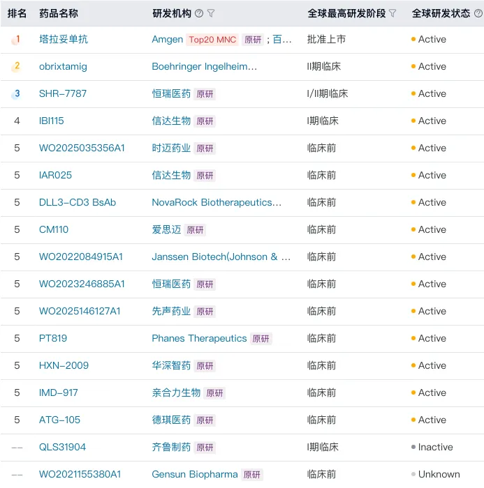 率先在实体瘤中取得实质性突破的是CD3/DLL3双抗,在预后较差且缺乏有效治疗手段的小细胞肺癌领域,安进/百济的塔拉妥单抗已率先获批,且仅上市半年便创下了1.15亿美元的销售佳绩,迅速印证了这一技术路径的商业化潜力。紧随其后的,是国产药企在这一新兴赛道上的迅速响应与集中发力。目前全球处于临床阶段的三款CD3/DLL3双抗中,有两款出自中国本土企业(恒瑞与信达),且多家公司已在临床前阶段提前布局,有望持续释放竞争力。