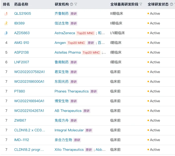 CLDN18.2作为近年来最受关注的新兴靶点之一,在胃癌/胰腺癌等实体瘤中有着较高的表达率,目标人群明确,且目前全球尚无针对该靶点的双抗药物获批,窗口期仍然存在。齐鲁制药和信达生物率先在这一赛道上突围,双双进入临床领先梯队,早期数据显示出良好的安全性和抗肿瘤活性。齐鲁更是在近期启动了CD3/CLDN18.2双抗联合化疗用于晚期胰腺癌一线治疗的注册性III期临床,显露出加速推进的战略意图。与此同时,鲁南制药、君实、东阳光、博安等企业也相继展开布局,从临床前到I期形成梯队推进。随着更多数据的积累,这一靶点有望成为国产TCE切入实体瘤的重要突破口。