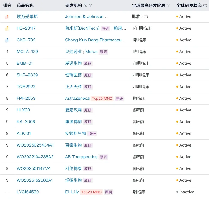 双通路阻断策略同样在实体瘤治疗中展现出强劲势头。以EGFR/c-Met双抗为代表,强生的埃万妥单抗已完成机制验证并成功上市,在EGFR突变型NSCLC的一线治疗中,其与三代TKI联合使用可将患者的PFS延长7个月,该药还可联合化疗进一步覆盖更多NSCLC一线、二线适应症。国产同类产品中,普米斯/翰森已推进至II/III期临床,贝达的MCLA-129处于II期,并已授权海外;岸迈、恒瑞、正大天晴等企业也在早期临床持续推进中。