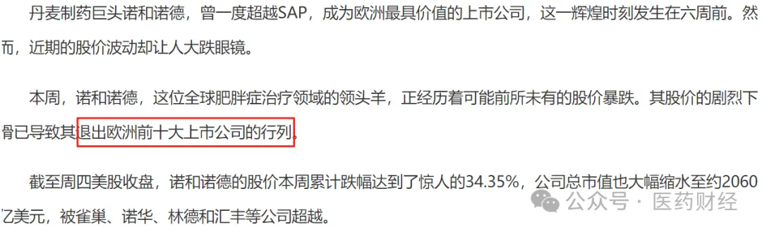2025年7月29日,丹麦制药巨头诺和诺德宣布大幅下调全年业绩预期后,华尔街资本用脚投票——单日市值蒸发超600亿美元,随后三个交易日累计跌幅达34.35%,市值蒸发近900亿美元,跌出欧洲上市公司前十榜单。
