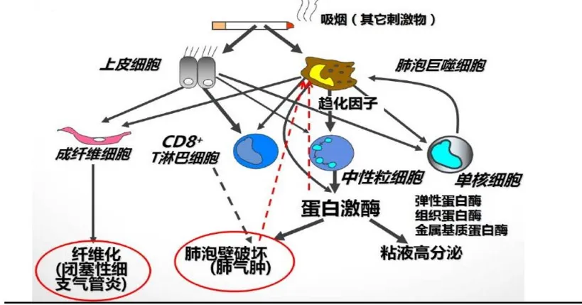 从医学定义看,COPD是以持续气流受限为核心的肺部疾病,包含慢性支气管炎和肺气肿两种表型。其核心病理机制可概括为 “三重打击”:一是慢性炎症导致气道黏液高分泌,阻塞气道;二是蛋白酶失衡破坏肺泡弹性纤维,造成肺泡破坏(肺气肿),气体交换受损;三是反复炎症触发气道壁纤维化和平滑肌增生,导致气道不可逆狭窄。三者叠加,导致患者呼吸困难渐进加重,从活动后气短,发展至静息时亦无法顺畅呼吸。