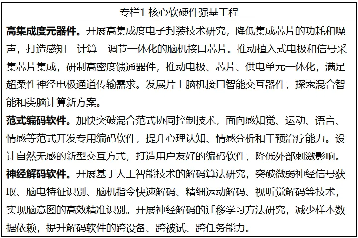(二)突破关键脑机芯片。发展高通道、高速率脑信号采集芯片,强化模数转换、通道管理和噪声抑制,增强脑信号采集放大能力。研发高性能、超低功耗脑信号处理芯片,强化并行处理能力,推动感知、计算和调节等功能的一体化集成。研发超低功耗、高速率、高可靠的通信芯片,提升脑信号传输和抗干扰能力。