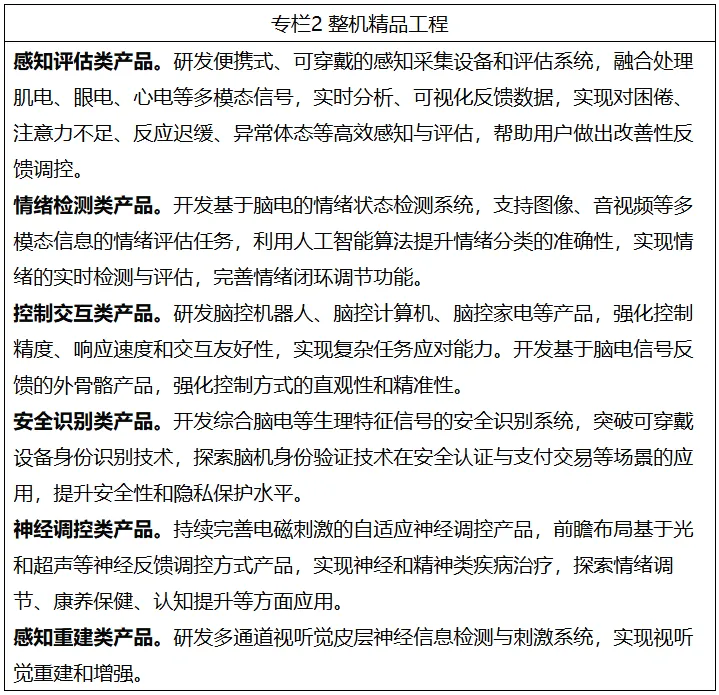 (十六)加强政策支持。加强脑机接口技术攻关和应用示范,推动布局实施一批重大项目,强化协同攻关能力。推动国家制造业转型升级基金、国家中小企业发展基金等加大投入,实施“科技产业金融一体化”专项,发挥国家产融合作平台作用,带动更多资本投入。对植入式脑机接口医疗器械等重点产品加大注册指导,给予优先支持。用好首台(套)、首批次保险补偿政策,加快产业化落地。