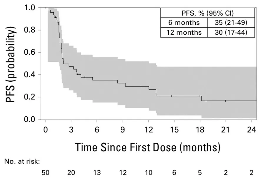 2、无进展生存(PFS):6个月无进展生存率(PFS)为35.1%(95%CI:21.2-49.3)(详见下图)。
