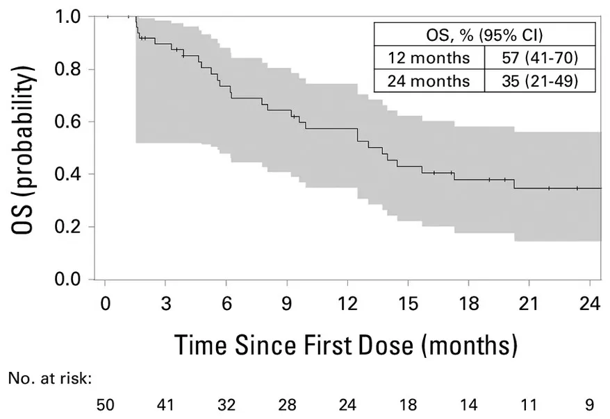 3、中位总生存期(OS):中位OS为13.7个月(95%CI:8.0-20.3),12个月和24个月总生存率分别为57.3%(95%CI:41.4-70.3)、34.7%(95%CI:20.7-49.2)(详见下图)。