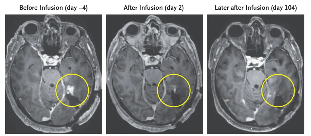 《新英格兰医学杂志(NEJM)》报道了一个“采用 CARv3-TEAM-E T 细胞[这是一种针对表皮生长因子受体(EGFR)变体Ⅲ特异性CAR-T细胞],治疗 EGFRvIII 阳性胶质母细胞瘤”的振奋案例,治疗后肿瘤显著缩小、肿瘤标志物也下降。