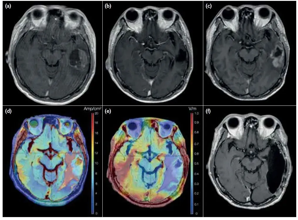 诊断后18个月,患者出现局部肿瘤复发,遂接受第二次开颅手术及全切除术(图1c),术后采用二线洛莫司汀化疗联合TTF治疗。治疗后,患者ECOG状态为1,生活质量良好,截至2022年已存活45个月(超3年),远高于传统治疗预估的15个月中位总生存期。