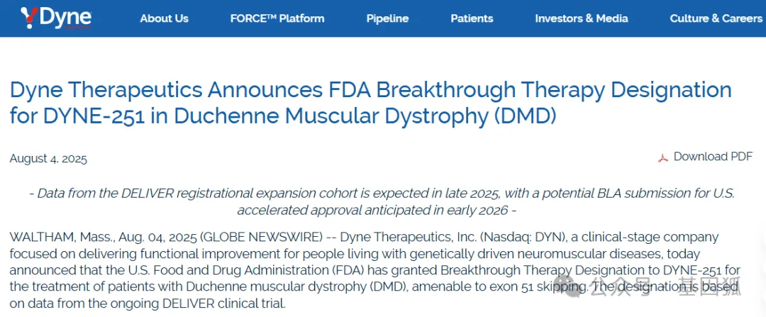 当地时间2025年8月4日,Dyne Therapeutics公司宣布,美国FDA已授予其在研药物DYNE-251突破性疗法认定 (BTD),用于治疗适合外显子51跳跃的杜氏肌营养不良症 (DMD) 患者。该认定主要基于DELIVER 1/2期临床试验中观察到的积极的生物标志物和功能性终点数据。DYNE-251此前已获得FDA授予的快速通道和孤儿药资格和罕见儿科疾病认定。