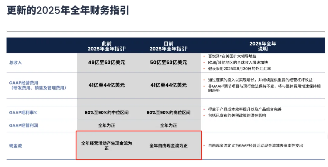 更值得让市场注意的是,百济神州在2025年全年财务指引的变更上,除了收入和GAAP毛利率做了上调的调整外,现金流指引从“全年经营活动产生现金流为正”变更为“自由现金流为正”,这也是一个强有力的积极信号。