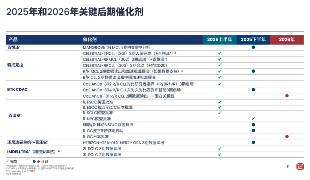 展望百济神州后续的新增长点,依然是市场关心的重要话题。在公司预告的未来18个月迎来超过20项研发里程碑中,百济神州2025H2即将要达到的里程碑中显然有一系列重磅事件,分别是索托克拉治疗R/R MCL关键二期数据读出并加速批准提交上市、BGB-16673启动头对头匹妥布替尼治疗R/R CLL的三期临床。