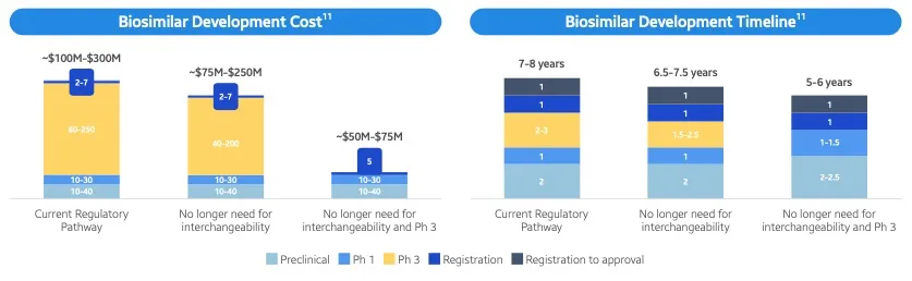 另一份来自三星旗下Samsung Bioepis的报告显示:目前,生物类似药的开发成本在1亿至3亿美元之间,开发时间跨度为7~8年。简化开发的提案可能使美国生物类似药开发成本减少5000万~2.25亿美元,时间缩短1~2年。