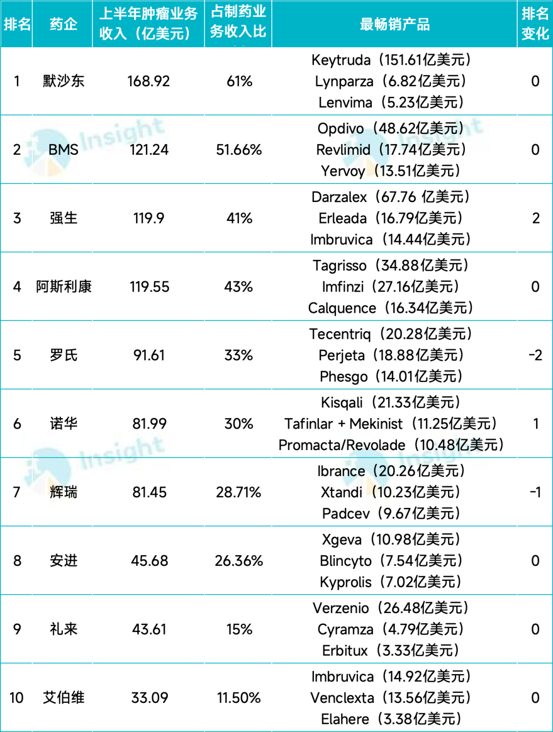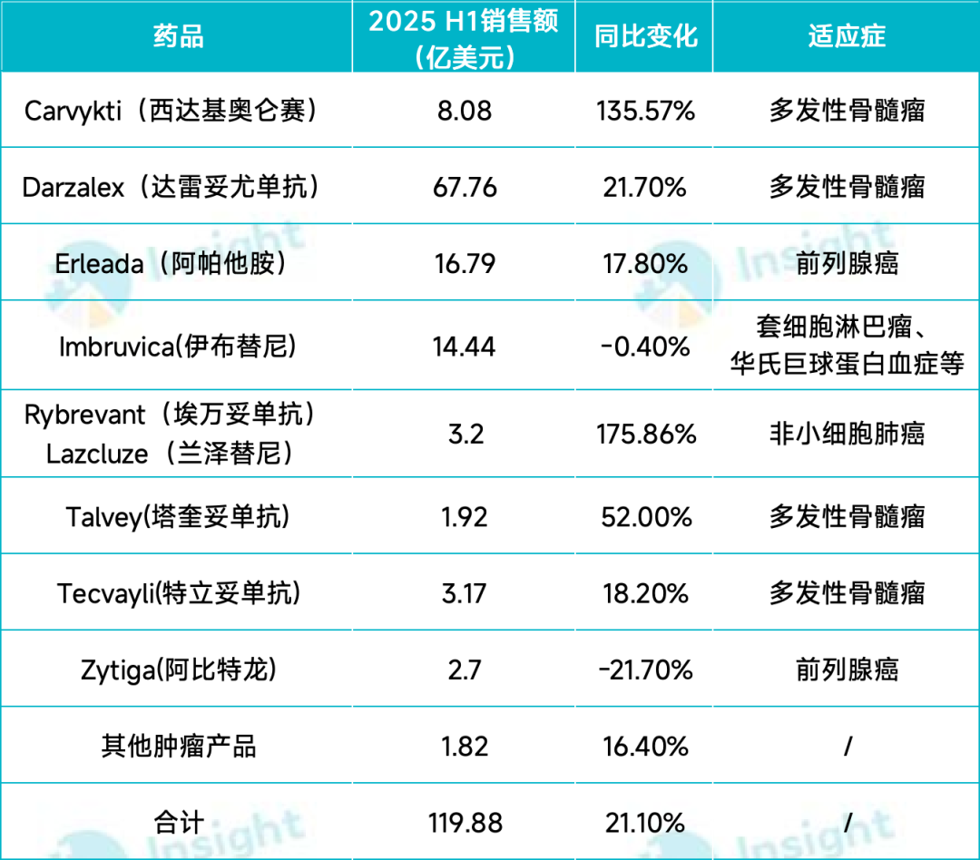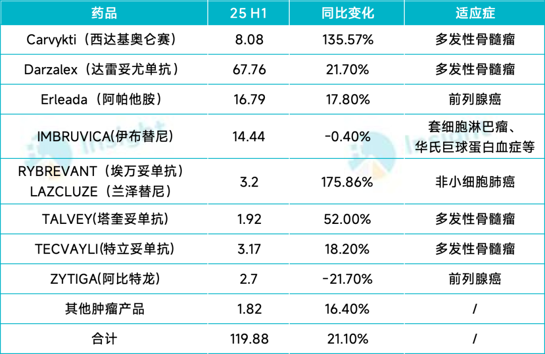 强生依托在多发性骨髓瘤优势领域精心打造的产品矩阵,半年度收入首次突破 110 亿美元,排名从 2024 年的第 5 名成功上升至了第 3 名。
