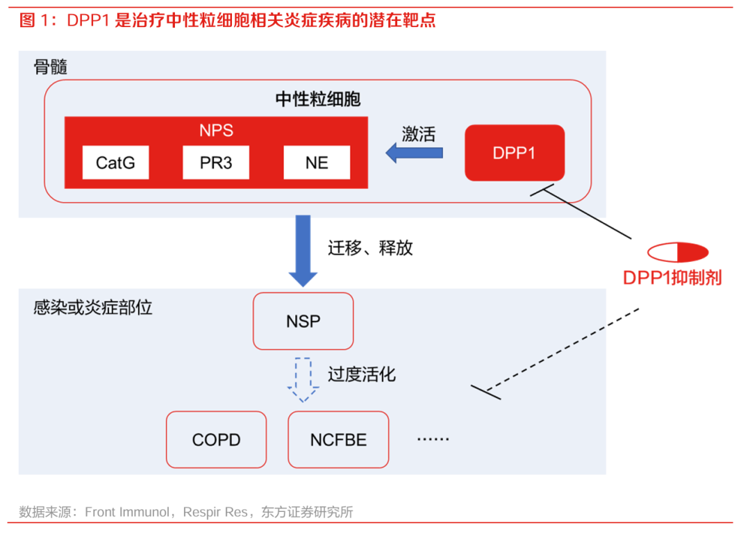 DPP1(二肽基肽酶1)是一种溶酶体半胱氨酸蛋白酶,其主要在骨髓中性粒细胞前体(早幼粒细胞阶段)中表达,它的核心功能是激活三种NSPs,据已有临床数据显示,DPP1抑制剂在骨髓中抑制DPP1后,成熟中性粒细胞携带至外周循环的活性NSPs减少60-70%,从根源降低其组织破坏潜力,达到治疗对应疾病的疗效。