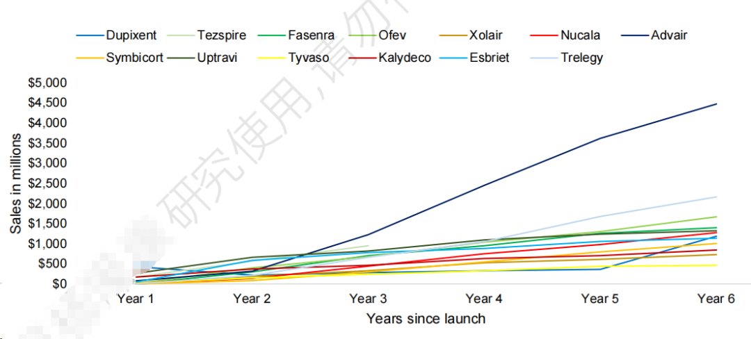 这一乐观的市场预测也基于历史上呼吸科创新药的优异表现,历史上推出的呼吸系统药物在上市5年后平均销售额已超过10亿美元,无论是针对稀有疾病(比如特发性肺纤维化、囊性纤维化),还是更常见的哮喘等疾病。