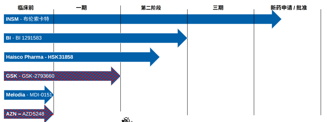 不过仅仅NCFBE适应症领域,海外机构普遍给了Insmed的首创DPP-1抑制剂Brensocatib大约50-60亿美元的销售峰值,主要基于几个方面:1)全球庞大的NCFBE的确诊人群;2)目前该适应症现有药物治疗主要基于对症缓解症状和控制感染,比如抗生素、支气管扩张剂和黏液溶解剂等,而Brensocatib显著降低患者病程加重的风险;3)Brensocatib的竞争格局良好,目前主要竞争对手都在三期之前,来自其他新DPP-1抑制剂的竞争预估要4年以上。