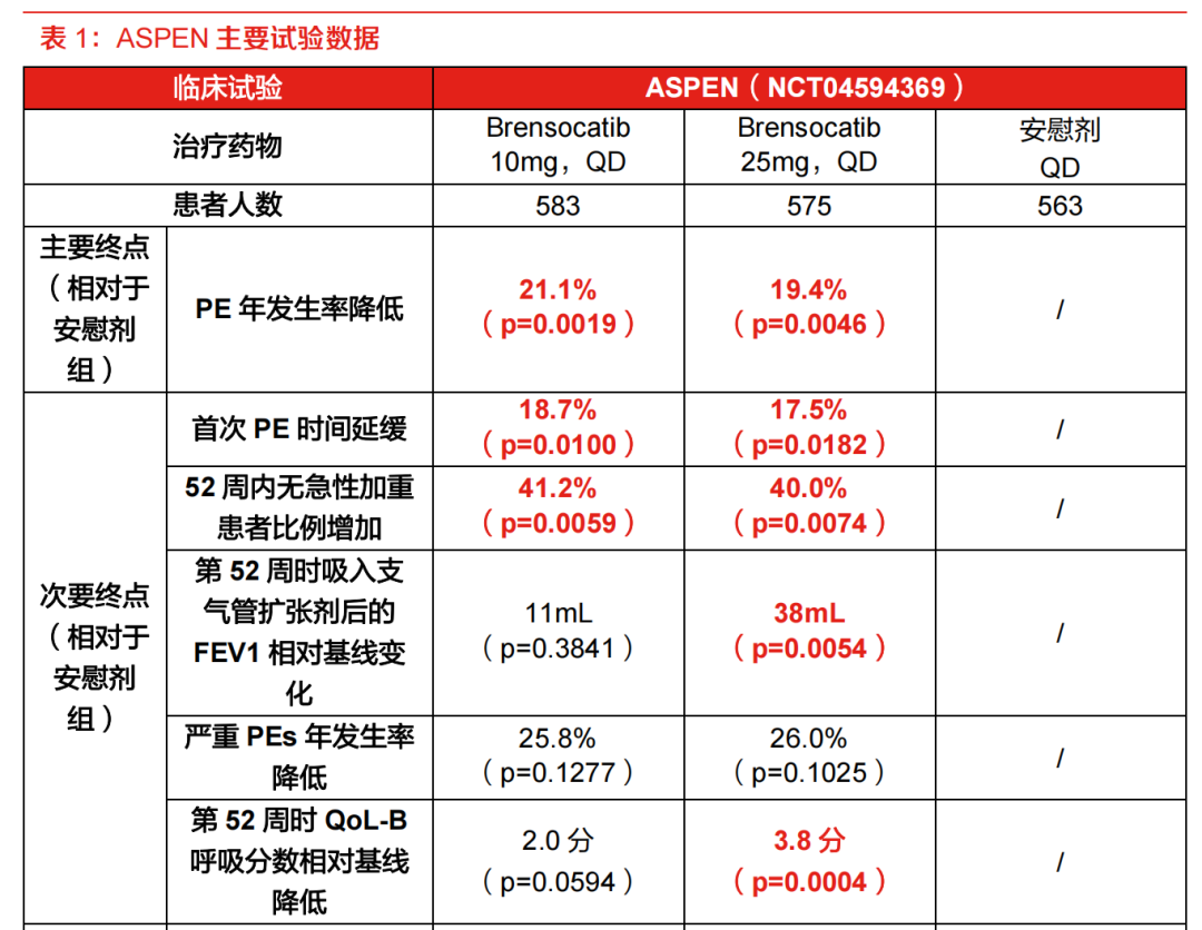 在NCFBE适应症,2024年5月Insmed宣布的三期临床研究ASPEN结果已经展示了明确的疗效证据。研究的主要终点是肺部急性加重(PE)年发生率,接受Brensocatib的10mg和25mg剂量组较安慰剂组分别降低了21.1%和19.4%PE年发生率,具备显著的统计学意义。