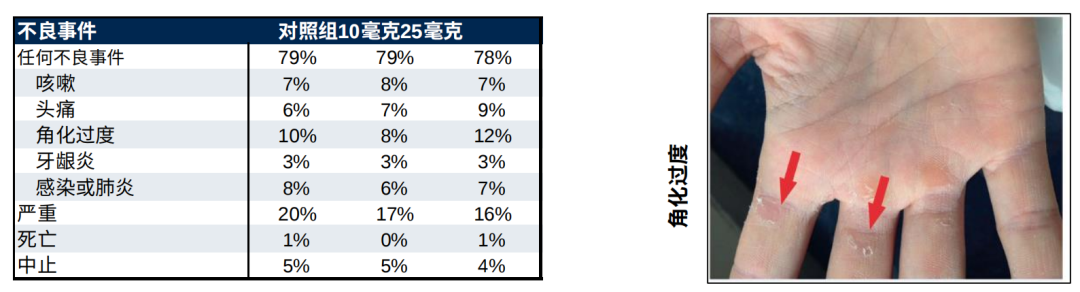 85.3%),如皮肤角化过度、牙周炎等重要不良反应未显著高于安慰剂组,总体安全性良好。