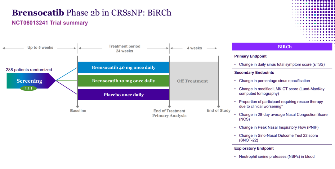 Brensocatib针对该适应症的二期临床BiRCh于2023年10月启动,分别设置10mg、40mg每日一次Brensocatib,持续24周,外加4周停药,总计28周,这项研究的数据预计在2025年底读出。