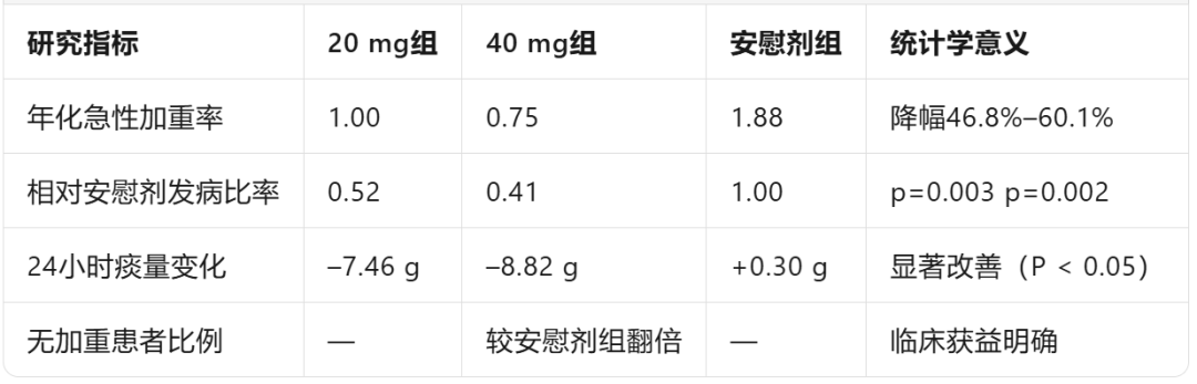 另外在无急性加重患者比例方面,HSK31858 20mg组显著高于安慰剂组,且40mg组效果更优,无加重患者比例翻倍。