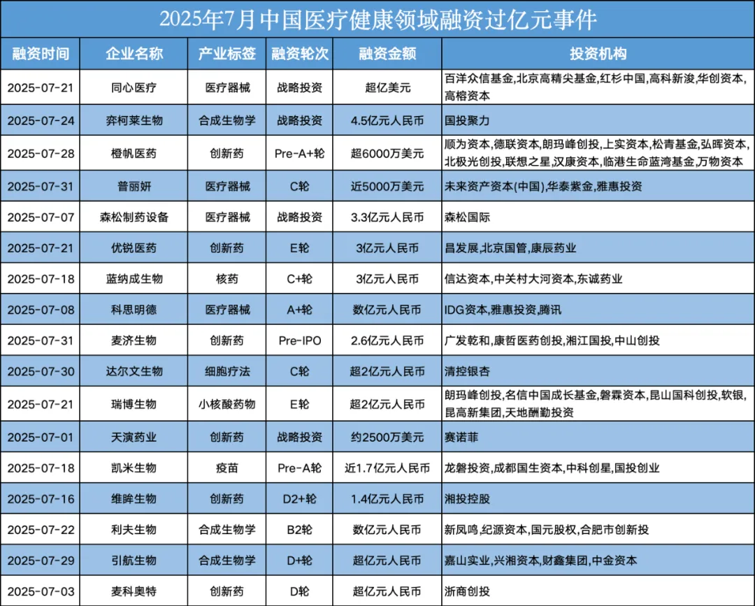 整体来看,相较于今年上半年的对早期项目的热情,今年7月的投融资更加“成熟”,“国家队”出手也更多、更大手笔、更稳健。创新药领域和医疗器械领域也有更多的细分赛道受资本青睐且融资金额逐渐增大。这也显示出,经历过热火烹油和寒冬淬炼后,投资者对国内医疗健康领域的投资理念和实操愈发熟练。