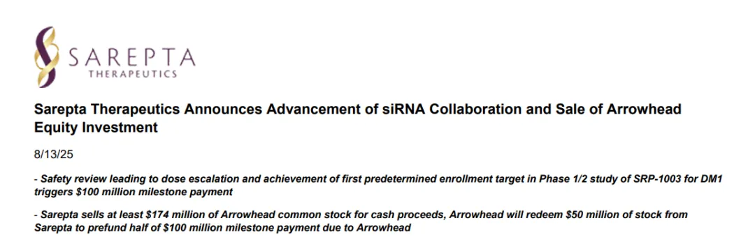 Sarepta 首席执行官 Doug Ingram 表示:“我们的潜在同类最佳 siRNA 项目取得了令人振奋的进展,其中包括 SRP-1003 在DM1适应症上的推进,这触发了向合作伙伴 Arrowhead 支付1亿美元的里程碑款项。出售所持 Arrowhead 股权是一项战略决策,旨在为支付该里程碑款项提供资金,但这并不影响我们对 siRNA 技术价值的信念,也不影响我们对 Arrowhead 在多种疾病领域应用该技术所做工作的信心。我们期待在今年下半年分享FSHD和DM1项目的早期数据。”