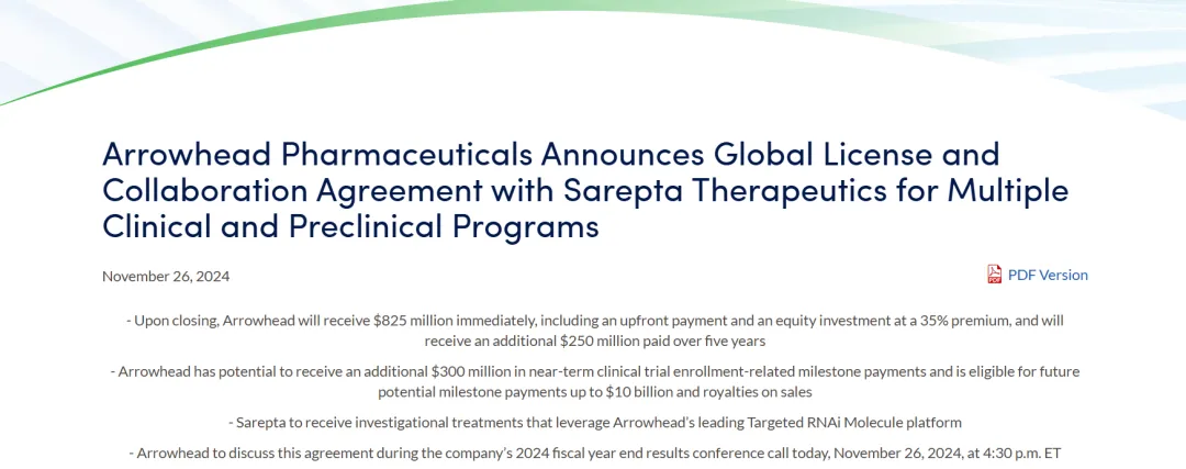 2024年11月26日,Arrowhead Pharmaceuticals与Sarepta Therapeutics达成合作协议,合作范围覆盖5款临床阶段和2款临床前管线,以及针对罕见病、遗传性肌肉疾病、CNS、肺部疾病开发最多6个靶点的siRNA药物。