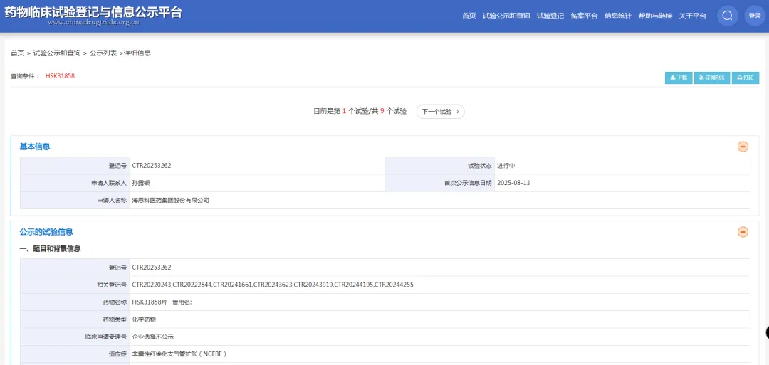 8月13日,药物临床试验登记与信息公示平台显示,海思科登记了一项多中心、单臂、开放扩展Ⅲ期临床,以评价HSK31858片在非囊性纤维化支气管扩张(NCFBE)患者中的长期安全性。据悉,该药是国内首个进入Ⅲ期临床的DPP-1抑制剂。
