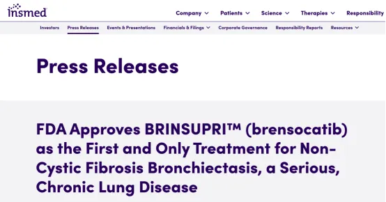 而就在前一天,Insmed宣布其DPP-1抑制剂Brensocatib(商品名:Brinsupri)获FDA批准上市,用于治疗12岁及以上儿童和成人NCFBE,成为该疾病领域首款靶向治疗药物。