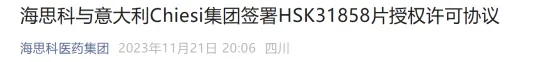 2023年11月,海思科以1300万美元首付款,最高4.62亿美元总额将HSK3185大中华区(包括港澳台)以外的权益有偿许可给意大利制药集团Chiesi。