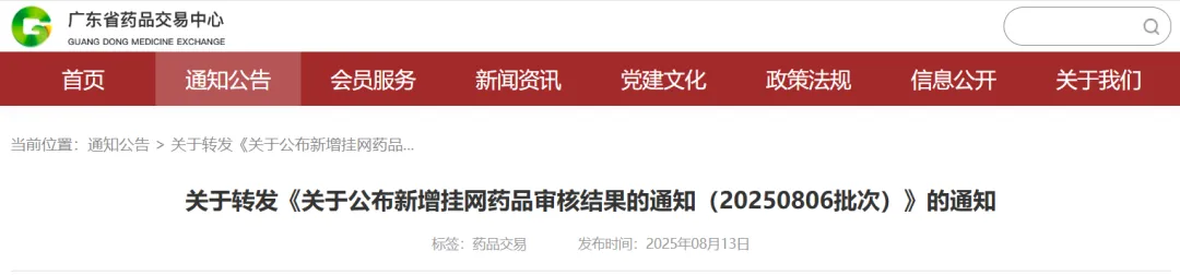 今日,广东省药品交易中心发布《关于转发<关于公布新增挂网药品审核结果的通知(20250806批次)>的通知》(下称《通知》)。