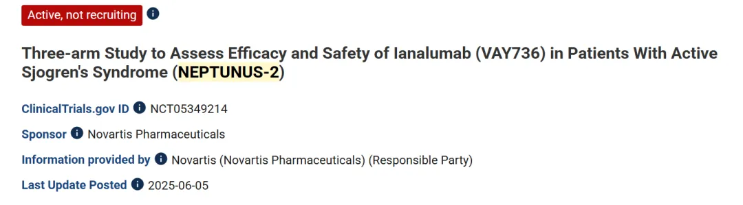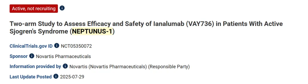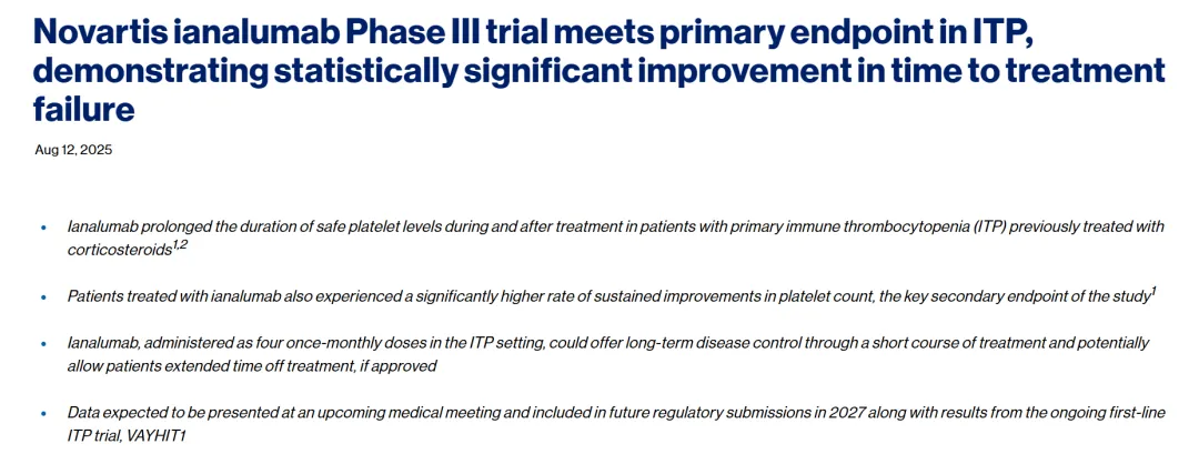 8月11-12日,诺华接连发布三份“喜报”——其自主研发的抗BAFF-R单抗Ianalumab(VAY736)在三项关键III期临床试验中接连取得突破性成果:包括两项针对活动性干燥综合征的全球多中心研究(NEPTUNUS-1、NEPTUNUS-2)及一项联合艾曲泊帕治疗原发性免疫性血小板减少症(ITP)的研究(VAYHIT2)均达到主要终点。这一系列成果不仅标志着Ianalumab有望成为首个获批用于干燥综合征的靶向治疗药物,更在ITP领域开辟了全新治疗路径。