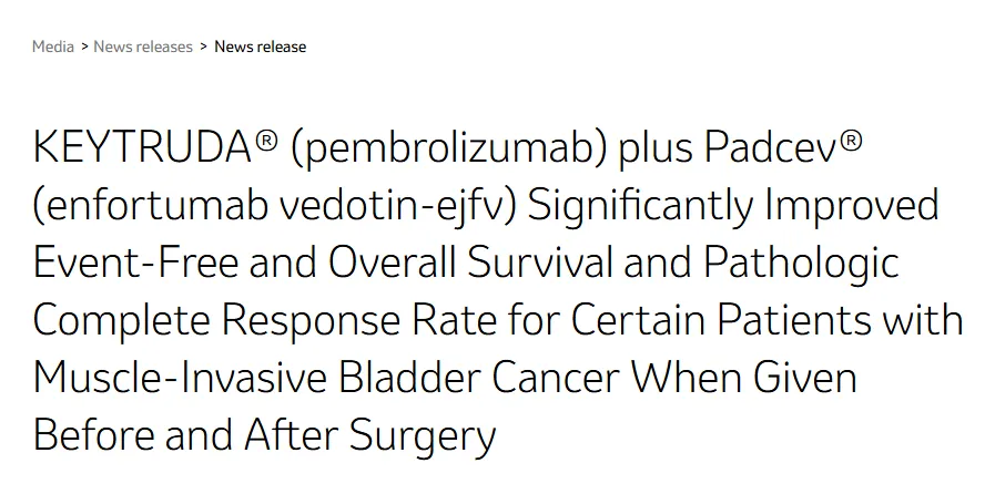 8月12日,默沙东宣布帕博利珠单抗(Keytruda)联合维恩妥尤单抗(Padcev)围手术期治疗肌层浸润性膀胱癌(MIBC)的III期KEYNOTE-905(EV-303)研究取得了积极结果。
