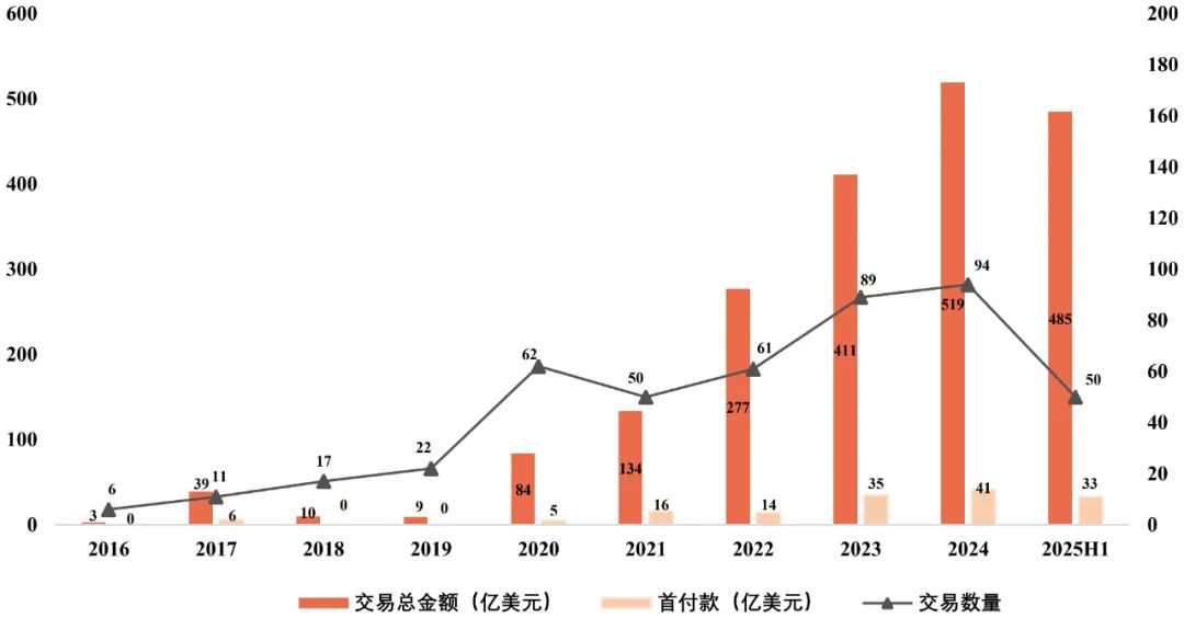 数据统计显示,2021年至2024年间,License-out(对外授权)交易数量持续攀升。进入2025年,仅上半年创新药相关交易数量已突破50笔。与此同时,交易金额亦呈快速增长态势:仅2025年上半年,已披露创新药License-out交易的首付款总额便达到33亿美元,交易总金额达到484.84亿美元。