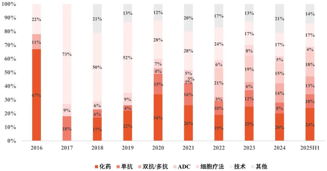 从License-out交易的类型来看,中国创新药出海已从“单点突破”迈向“多点开花”。在过去,交易主要集中于小分子化学药,近年来则迅速向生物制品拓展,涵盖单抗、双抗、多抗、细胞治疗、ADC(抗体药物偶联物)等多个前沿赛道。其中,中国在ADC领域已跻身全球创新前沿,根据Insight数据库全球新药研发数据,国产ADC新药约占全球管线的40%,已经成为全球ADC研发的核心参与者。此外,重磅ADC License-out交易持续达成,仅2025年上半年,ADC交易总金额接近200亿美元。