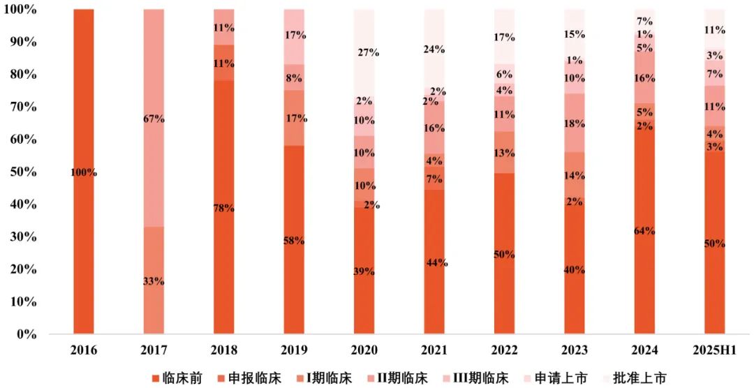中国生物医药产业的国际化进程,清晰地反映在研发阶段分布上。回顾2020年之前,中国License-out的项目不仅总量相对有限,其研发阶段也呈现出明显的不均衡性,多集中在个别阶段。然而,这一格局在2020年及之后发生了显著转变。项目数量大幅攀升的同时,其研发阶段的覆盖范围也显著拓宽,实现了从临床前探索到后期确证性研究乃至申报上市的全阶段覆盖。