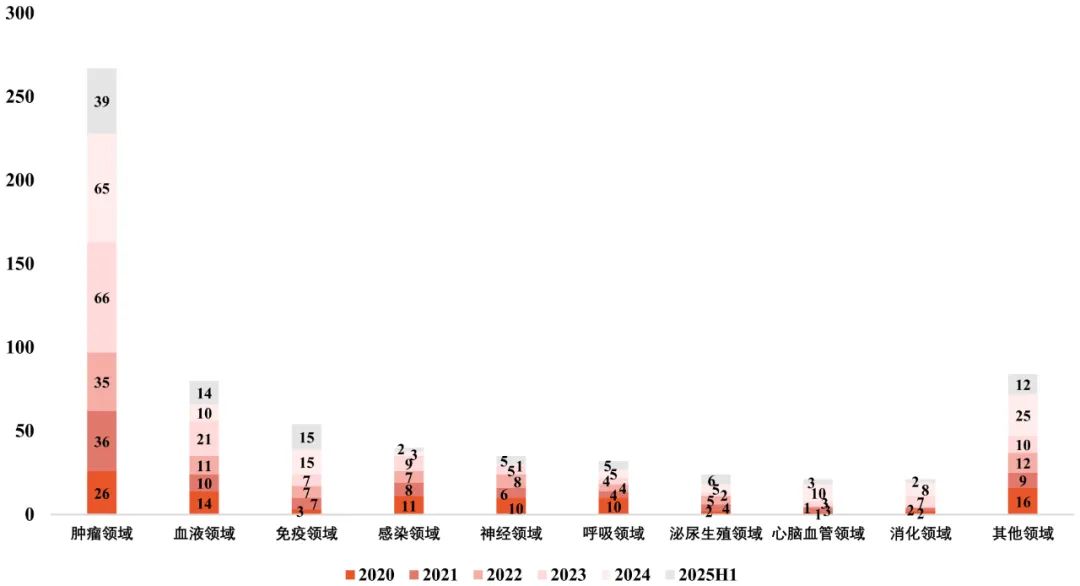 肿瘤领域交易持续占据主导地位,仅2025年上半年即达成39项肿瘤领域License-out。与此同时,随着创新药研发的深入和国际药企对其他领域需求的增加,自身免疫、代谢、神经系统等疾病领域的License-out项目也在不断增加,说明中国企业的研发布局逐步走向多元化,其在国际市场的合作深度和广度也持续提升,进一步推动着全球创新药生态的发展。