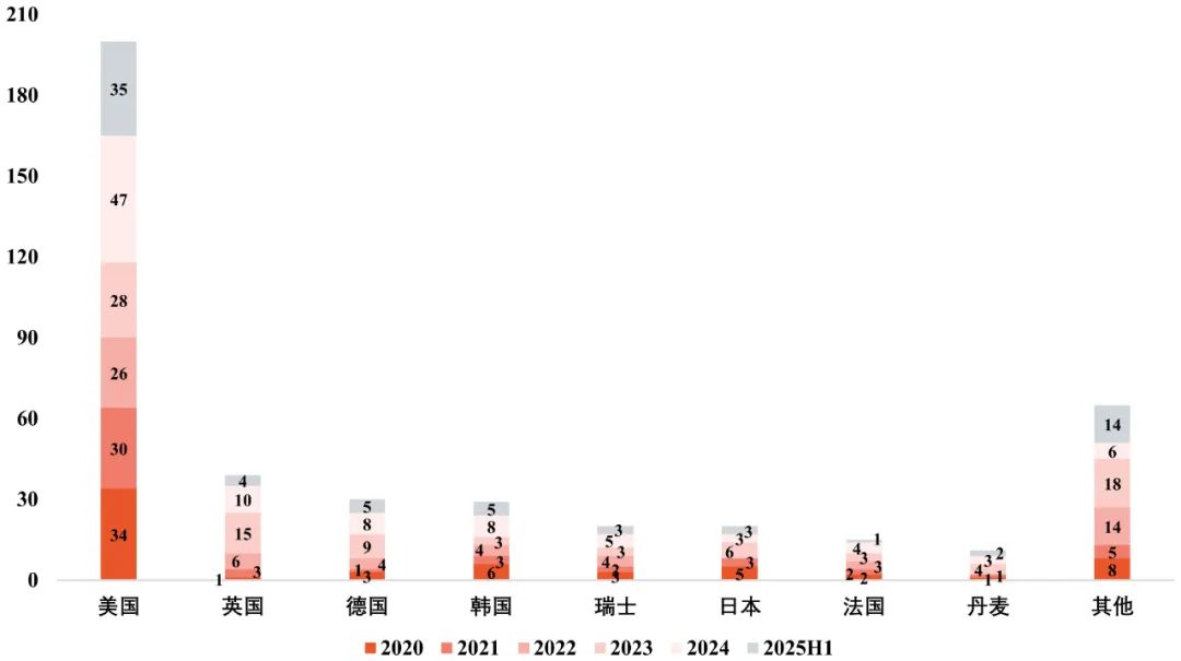 美国作为中国License-out交易的主要受让方,交易数量持续居于前列。这一趋势反映了美国作为全球最大的药品市场,对中国创新药的高度认可。中国药企通过License-out模式,将创新药的海外权益授权给美国企业,利用美国市场的三重优势(强大的监管体系、研发环境和市场基础设施)进一步放大了中国创新药的全球价值。