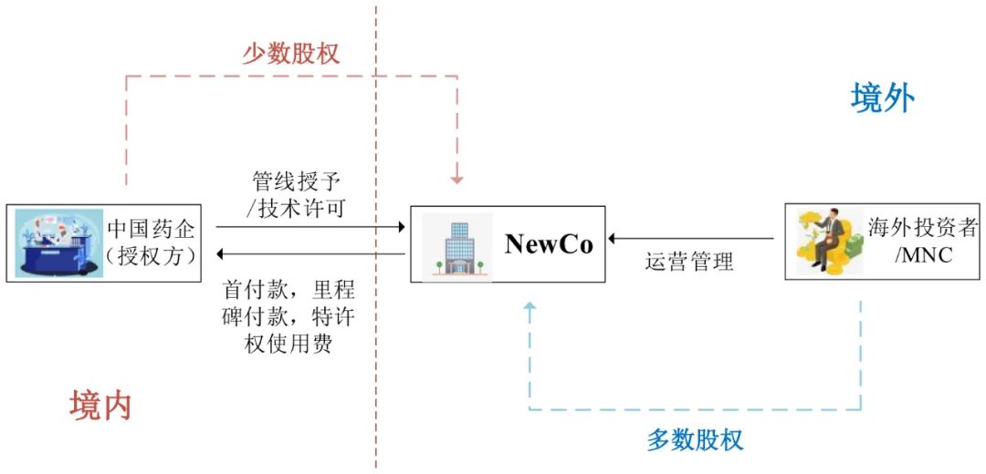 (2)权益授权与对价获取:授权方通过授权许可协议,将特定管线在目标区域(如海外市场)的开发权利(涵盖早期研发资产及相关知识产权,包括但不限于专利、技术诀窍及商业秘密)授予NewCo。作为对价,授权方获得NewCo的股权及约定的许可费用。这种架构通过股权纽带,将原研方与产品的长期商业成功深度绑定。