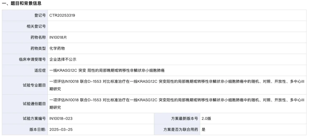 8 月 19 日,药物临床试验登记与信息公示平台官网显示,应世生物登记了一项评估 IN10018(Ifebemtinib)联合 D-1553(格索雷塞)对比标准治疗在一线 KRAS G12C 突变阳性的局部晚期或转移性非鳞状非小细胞肺癌中的随机、对照、开放性、多中心 III 期研究(IN10018-023)。这是 IN10018 启动的首个 III 期临床。