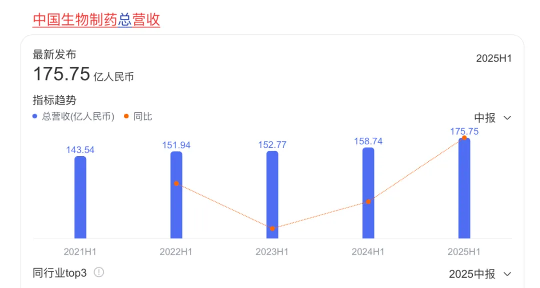 昨日,中国生物制药发布了半年报,2025年上半年营收175.7亿元,同比增长10.7%;持续经营业务归母净利润33.9亿元,翻倍大增140.2%;经调整归母净利润30.9亿元,同比增长101.1%。除此之外,创新产品收入及占比快速攀升,占总收入比例已达44.4%。