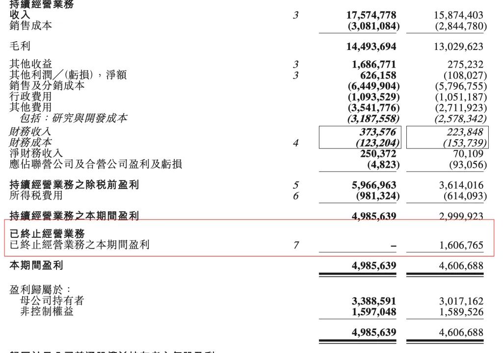 说完毛利率,再说净利润。其实如果单看净利润的话,会觉得中生的净利润增长不太明显,或者说不太sexy(30.17亿→33.89亿)。但是如果我们去细看财报,会明白问题所在:去年的盈利业务中,已终止业务占了很大一部分,比持续经营业务的利润一半还多,这部分业绩来源于2023年中国生物制药对几家子公司股权的剥离,例如正大青岛的出售在2024年3月份完成。也正因为此,2024年前六个月,这些已经出售的公司产生了16亿元左右的盈利,这些算在了已终止经营业务里。