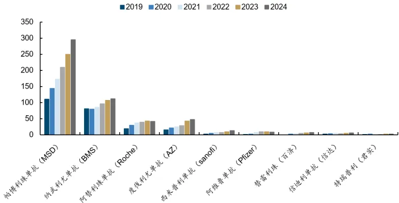 2024 年,全球主要 PD-(L)1 单抗销售额超 500 亿美元,其中帕博利珠单抗(K 药)以 294.8 亿美元(占公司总营收 46%)蝉联全球「药王」。行业预测,到 2028 年,PD-(L)1 抑制剂的销售峰值将超过 900 亿美元。