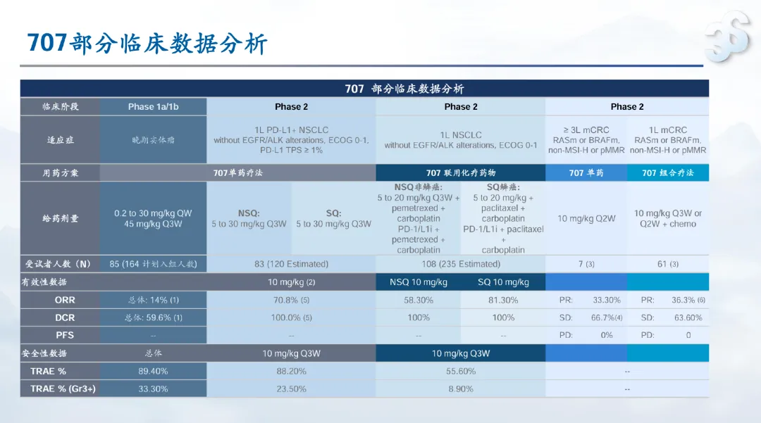 SSGJ-707 在早期临床试验中也展现出令人鼓舞的结果。SSGJ-707 联合化疗一线治疗驱动基因阴性非小细胞肺癌的 2 期临床研究中,非鳞状非小细胞肺癌患者的 ORR 为 58.3%,DCR 为 100%;鳞状非小细胞肺癌患者的 ORR 为 81.3%,DCR 为 100%。