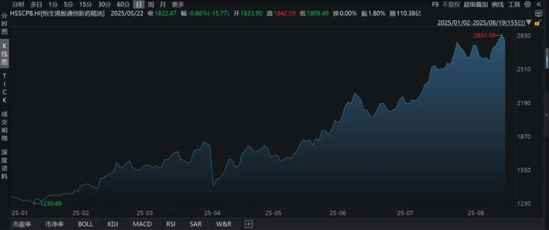 告别前几年的“牛夫人”时代,板块化身资金竞逐的“小甜甜”——截至8月19日,恒生港股通创新药精选指数年内飙升108.09%,刷新2018年以来的半年涨幅纪录。交银证券对此断言:2025年正成为医药行业从“估值修复”迈向“价值重估”的关键转折之年。