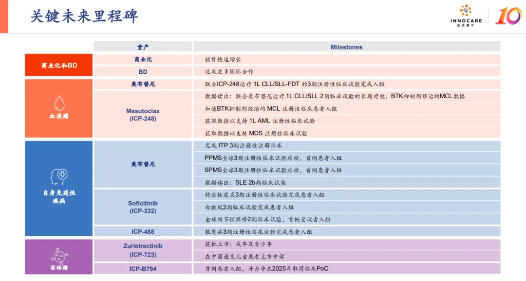 自主研发的BCL2抑制剂mesutoclax(ICP-248)获得突破性疗法认定,两项注册临床研究加速推进,新公布的一线治疗急性髓系白血病(AML)的数据亮眼,有效性和安全性都优于竞品数据。作为中国首个获BTD认定的BCL2抑制剂,ICP-248直接布局一线淋巴瘤适应症,覆盖更广泛患者群体,有望实现弯道超车,市场潜力显著。