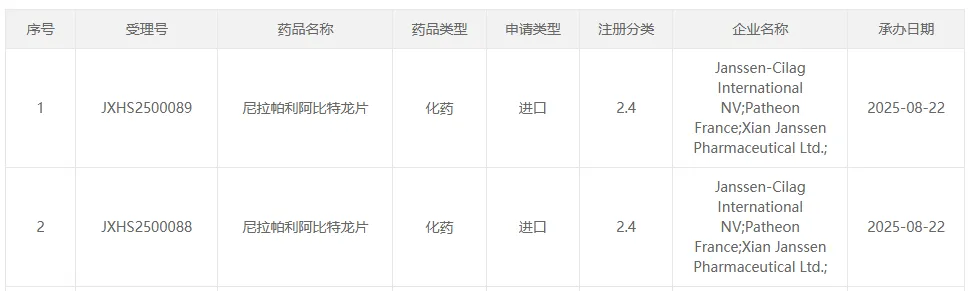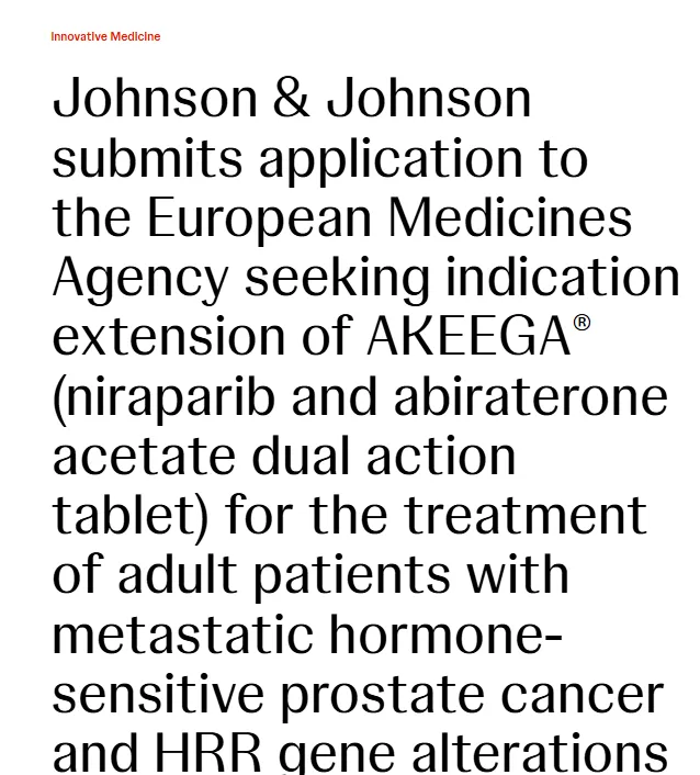 8月22日,中国国家药监局药品审评中心(CDE)官网显示,强生提交的尼拉帕利阿比特龙片新适应症上市申请已正式获得受理。结合强生近期在全球的注册申报动态及相关临床证据推测,此次国内申报的适应症很可能与2025年7月其在欧洲提交的扩展申请一致:联合泼尼松或泼尼松龙用于治疗激素依赖性前列腺癌患者。