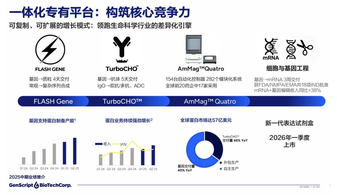 据介绍,其FLASH™基因合成服务从基因序列到质粒,只需4个工作日,再到之后的mRNA体外转录和LNP递送,仅需3周。而TurboCHO™平台从序列到抗体,仅需5个工作日,上半年该平台针对外包客户的交付量同比增长超46%,内部进行蛋白生产的交付量同比增长超40%。