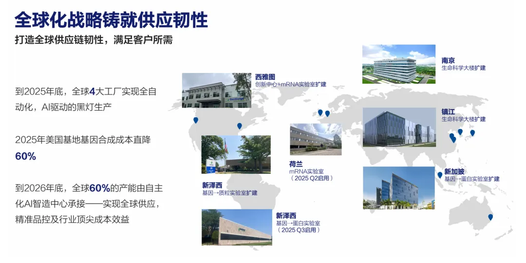 接下来,AI的深度参与还将进一步提高交付效率和韧性。据介绍,预计到2025年底,金斯瑞的5个主要生产基地中有4个将升级为全自动化AI工厂,实现24小时不间断生产,人工干预降至最低。今年,其美国的分子生产基地通过自动化改造将降低60%的生产成本。明年,AI智能自动化将会覆盖其60%的核心业务。