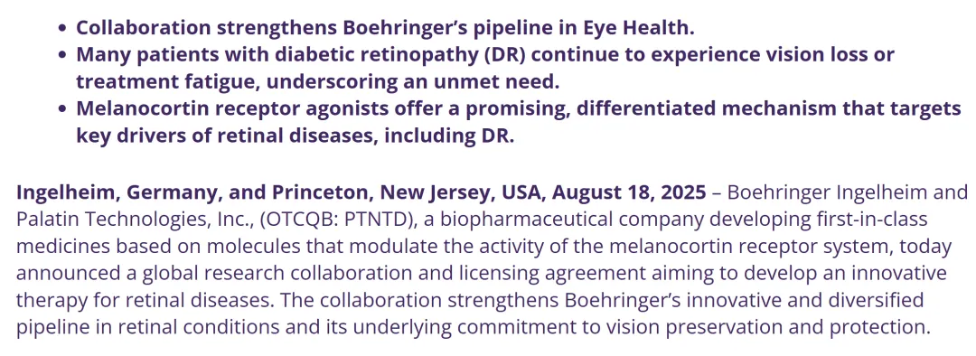 8月18日,勃林格殷格翰与Palatin Technologies宣布建立全球研究合作及许可协议,这项合作旨在开发潜在的同类首创黑皮质素受体靶向疗法,以造福广大视网膜疾病患者。