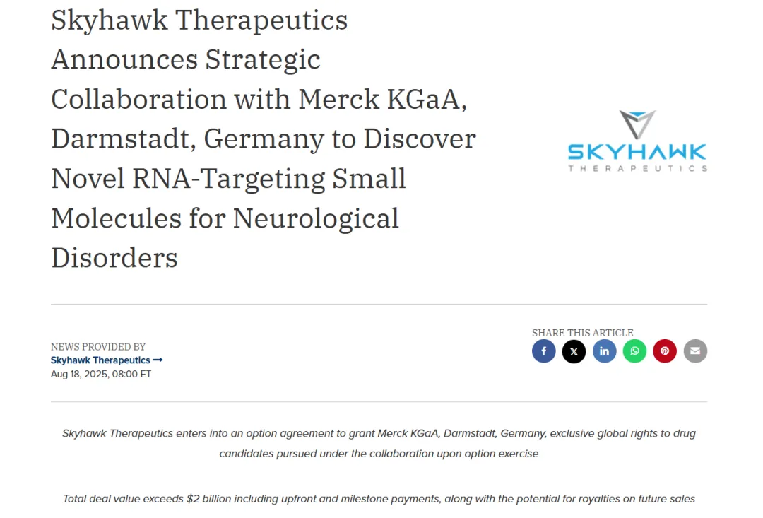 8月18日,Skyhawk Therapeutics宣布与德国默克达成战略研发合作。此次合作将专注于发现新型靶向RNA的小分子,用于治疗某些具有高度未满足医疗需求的神经系统疾病。